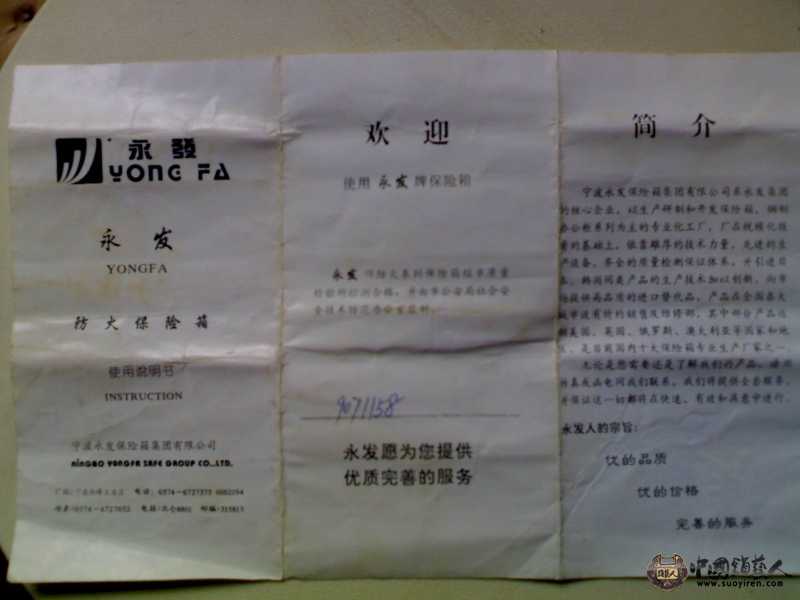 当我和她来到一个隐蔽的储藏间,看到我们的“目标”时,我大吃一惊:最少有20岁的永发古董级“保险柜”! 这个保险柜,是我们永发生产的最早的保险柜,也是中国保险箱行业的早期典型:三片机械密码,一个一字型弹子锁,一个隐藏的喇叭孔,一个一字型手柄,简洁却极富内涵,蓄积着永发的安防安全理念! 客户的长辈近期仙逝,钥匙和密码全部没有交接!我核实了身份以后,开始作业,十几分钟后,保险柜被打开,零部件一切正常,换掉主锁,调试保险柜,犹如新的一般灵活,除了整齐存放的资料类遗物之外,我发现保险箱的全套资料竟然也是完好无损---- 我在保险箱行业从业十几年,很少看见过这么多年,能够把保险柜保养得如此之好的主人,一种敬仰之感,油然而生! 在修复和交接过程中,我和客户唠嗑,言来语去,她无不流露出对故人浓浓的思恋与欣慰! 她说,老人是文艺工作者,那是在十几年前的一个夏天,人们都在马路上乘凉的时候,家里被小偷光顾了,一批珍贵的手稿和资料被毁掉,气愤之余,第二天就买了一个永发保险箱,说起永发之缘,她说老人经常看报纸,对永发保险箱比较了解,还知道永发的胡董,把水泥保险柜全部回收报废的壮举!之后的日子里,这个保险箱就一直在床头陪伴着他,守护着他的思绪与回忆,几乎每天要用抹布擦拭保险箱----- 临别时,我向她提出拍照的要求,她犹豫了一下后、同意了!她说:永发保险箱,守护了他大半生美好的回忆,就算是我们对他的缅怀吧---- 一路想来,保险箱一直是和经济财富相提并论,今天,我感觉到了,保险箱与情感之间的距离---零距离!