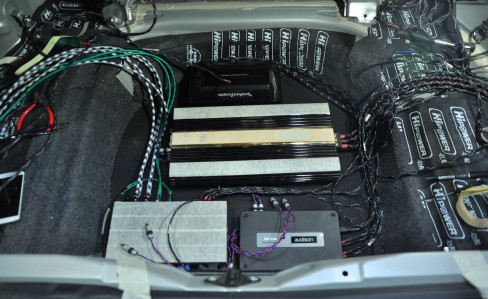 2 H7 q" r) Y5 l& T尾箱第二层的欧迪臣HV王者功放及qrattro四路功放,他们是负责整个前声场的。丹拿的准头,欧迪臣的柔,纯甲类音质型功放,音质细腻,细节丰富。另外线束布置也相当规范。