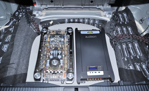 ! T J" Z/ P" E. M尾箱完工图,尾箱工作淡雅大方,简单低调,仍然可以放不少的其它东西。作为整个声场的陪衬低音炮的使用与调节是至关重要的。) t1 h- f" v* N: o