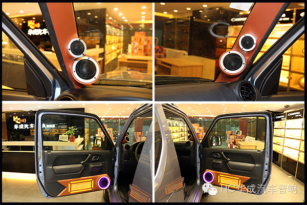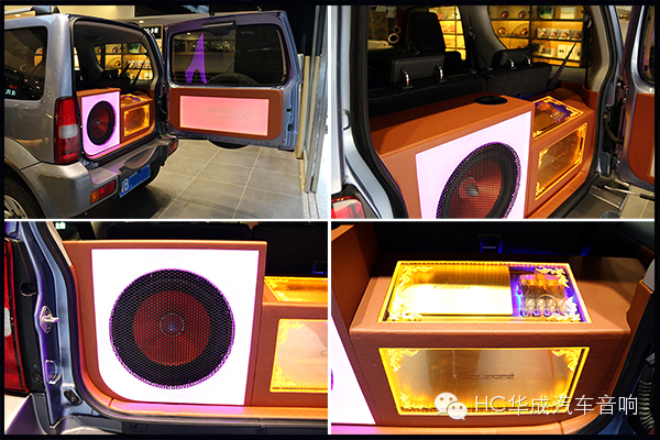 & h; `4 U; m) a$ h7 U# r 而当车主前来提车时,表现得异常惊喜、激动,简直不敢相信这就是前几天自己开的那辆十分普通的吉姆尼。 驾驶室左右两侧加装了高、中音套装喇叭,车门两侧替换成音质更佳的卡顿中音喇叭,其中在倒模处加装上橙色的LED门板装饰灯,中音喇叭边缘处附加上紫色灯,这些灯光能让夜间开启音响时变得更绚丽迷人。 9 I5 X* ^! F/ a- f* q% {