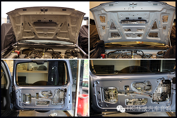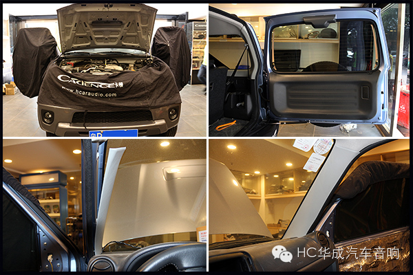 ' a: \. a% h6 T1 m0 G q$ ?待一切准备工作就绪后,改装工程正式开展。我们先是给车头、车门包上一层黑色布套,这用于减免在拆解和安装过程中出现的磕碰摩擦。此外,从引擎盖中可以看出原车是没有做任何隔音处理的,尾门挡板和原车A柱是纯塑料的。
