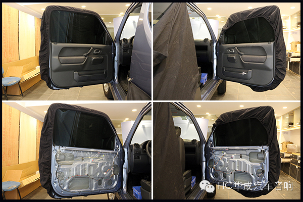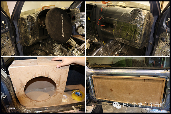 ( n4 x! E5 N; Z+ q# M, w7 r1 l$ g 然后开始拆解两侧车门,拆开门挡板后,我们发现原车门板未做过任何隔音的处理。