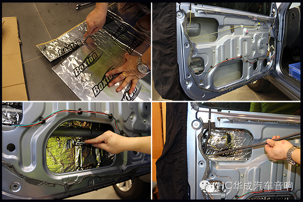 待一切拆解工序完成后,开始裁切Boxton隔音减震胶贴合车体,对于门板内侧的贴胶,我们采用滚轮来压实。