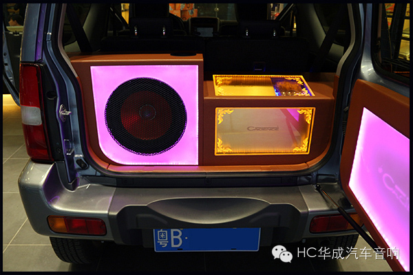 而车尾箱方面华成则专门针对紧凑车型打造了一套音响设备。低音音箱和功放盒紧密贴合于车尾,恰到好处地利用原车那“闲置”的车尾空间。并且在有机玻璃以及灯光的搭配下,更让车尾变成成了一道亮丽的风景。 ) V, B: E" P& w p3 t& l