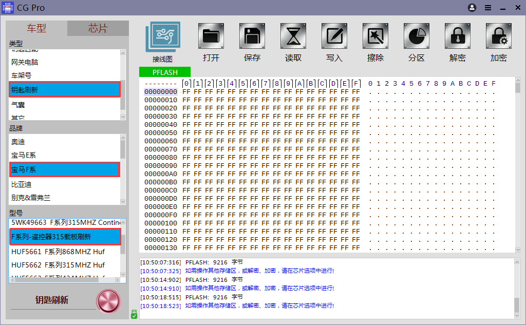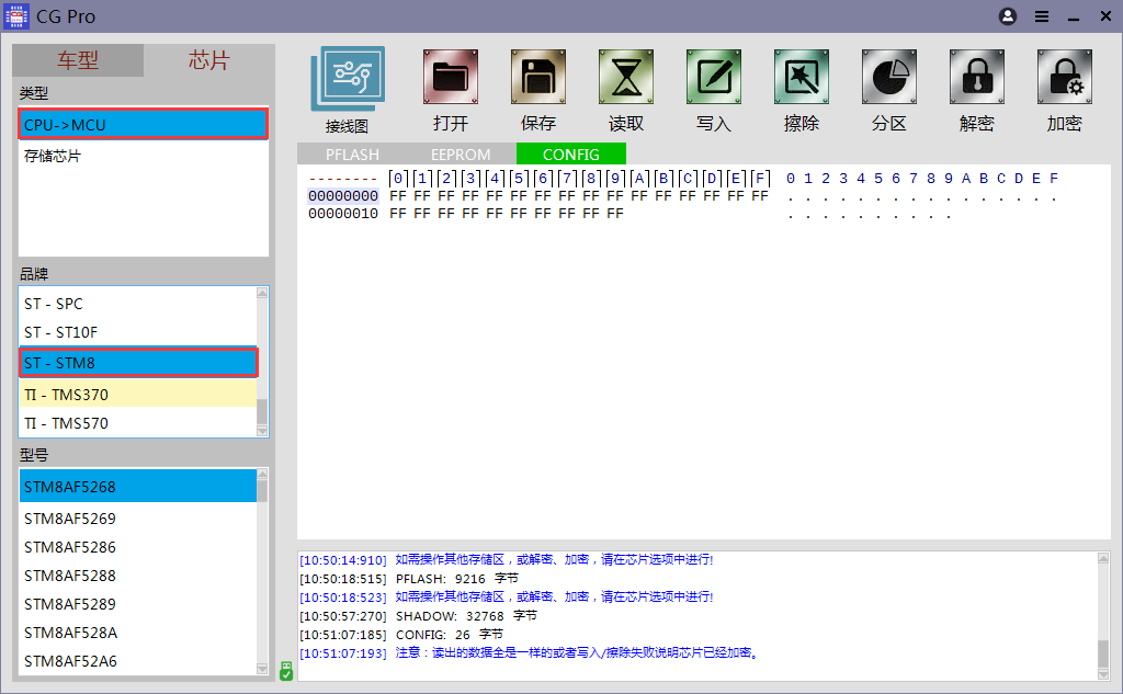 二、升级明细1、防盗电脑:福特 - 野马 T70 防盗盒 2、钥匙匹配:丰田 - 花冠 93C56 全丢 3、钥匙刷新: 宝马F系 - F系列-遥控器315载板刷新 4、芯片中增加型号支持:ST - STM8系列 STM8AF5268 STM8AF5269 STM8AF5286 STM8AF5288 STM8AF5289 STM8AF528A STM8AF52A6 STM8AF52A8 STM8AF52A9 STM8AF52AA STM8AF6213 STM8AF6223 STM8AF6223A STM8AF6226 STM8AF6246 STM8AF6248 STM8AF6266 STM8AF6268 STM8AF6269 STM8AF6286 STM8AF6288 STM8AF6289 STM8AF628A STM8AF62A6 STM8AF62A8 STM8AF62A9 STM8AF62AA STM8AL3136 STM8AL3138 STM8AL3146 STM8AL3148 STM8AL3166 STM8AL3168 STM8AL3188 STM8AL3189 STM8AL318A STM8AL31E88 STM8AL31E89 STM8AL31E8A STM8AL3LE88 STM8AL3LE89 STM8AL3LE8A STM8AL3L46 STM8AL3L48 STM8AL3L66 STM8AL3L68 STM8AL3L88 STM8AL3L89 STM8AL3L8A STM8L051F3 STM8L052C6 STM8L052R8 STM8L101F1 STM8L101F2 STM8L101F3 STM8L101G2 STM8L101G3 STM8L101K3 STM8L151C2 STM8L151C3 STM8L151C4 STM8L151C6 STM8L151C8 STM8L151F2 STM8L151F3 STM8L151G2 STM8L151G3 STM8L151G4 STM8L151G6 STM8L151K2 STM8L151K3 STM8L151K4 STM8L151K6 STM8L151M8 STM8L151R6 STM8L151R8 STM8L152C4 STM8L152C6 STM8L152C8 STM8L152K4 STM8L152K6 STM8L152K8 STM8L152M8 STM8L152R6 STM8L152R8 STM8L162R8 STM8L162M8 STM8S003F3 STM8S003K3 STM8S005C6 STM8S005K6 STM8S007C8 STM8S103F2 STM8S103F3 STM8S103K3 STM8S105C4 STM8S105C6 STM8S105K4 STM8S105K6 STM8S105S4 STM8S105S6 STM8S207C6 STM8S207C8 STM8S207CB STM8S207K6 STM8S207K8 STM8S207M8 STM8S207MB STM8S207R6 STM8S207R8 STM8S207RB STM8S207S6 STM8S207S8 STM8S207SB STM8S208C6 STM8S208C8 STM8S208CB STM8S208M8 STM8S208MB STM8S208R6 STM8S208R8 STM8S208RB STM8S208S6 STM8S208S8 STM8S208SB STM8S903F3 STM8S903K3