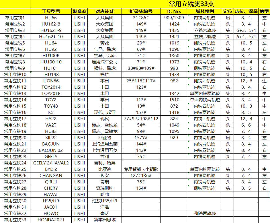 随着汽车防盗类型的不断更新和升级对应的专用工具也在跟进,从事锁业行业的同行们经常需要查询和车辆对应的开锁工具以及对应的钥匙头编号,这里就将现有的 李氏工具整理如下以便大家方便查询。 以下整理包括大家常用的类型和不常用类型,按照钥匙样式还分为平铣和立铣,以及添加了一些民用锁和摩托车锁的专用工具,大家可以按照自己地区工作的实际需求来进行工具的配备。 平铣常用类型: