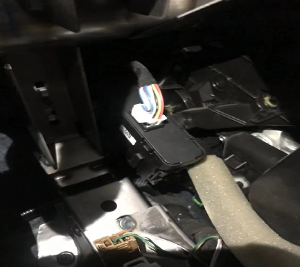 将设备与专用线束连接好,再与汽车相连接,如下图所示: 网关在刹车上分20公分靠近方向管柱处,有些车网关是16针插头,有些是32针插头,这个车是16针插头,所以将网关上的16针插头拔下来连接到我们的16+32连接线上(所以专用线束上的两个插头只需要插上一个即可)。