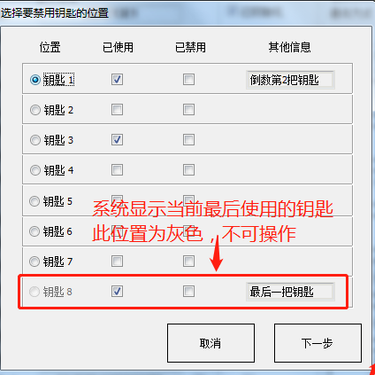 进入界面后会发现当前可以使用的钥匙位置是灰色的不允许操作,这就保证了用户不会因为误操作,导致当前钥匙被禁用。