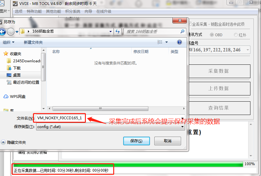 插入锁头后,等待设备采集,直到显示采集完成 根据车型的不同,采集的过程大约在5-10分钟左右 采集完成后保存数据,准备在线计算。