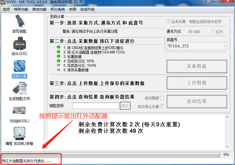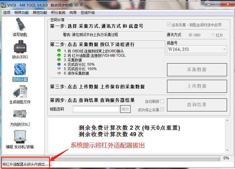 系统会反复提示:红外线适配器拔出,插入的操作。并且显示预计所需要的时间。 按照提示操作大约1-2个小时。如果中途采集失败,断开USB与OBD后重新连接,继续采集。