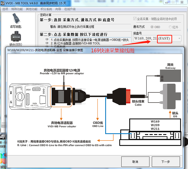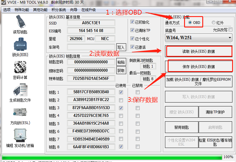 1:可以直接在车上进行采集,(操作过程与钥匙添加的操作步骤一致) 如果锁头自动判定锁头型号为(W166 197 212 218 246)那么便可以免拆卸操作 具体步骤如下: 连接好设备与车辆上的OBD接口,进入VVDI MB 软件中的:锁头EIS 界面使用自动诊断选项读出锁头类型并且保存数据。(此操作是为了避免发生意外在操作中丢失数据提前备份数据)