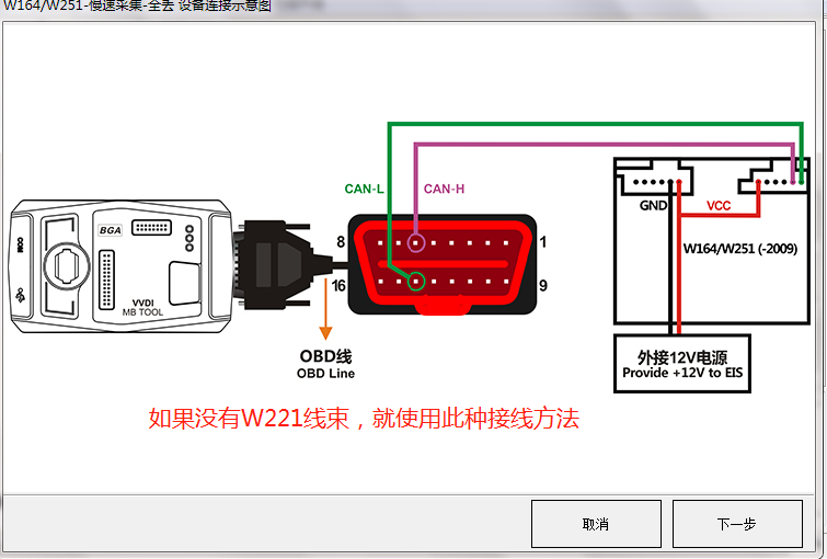 2:连接12V外接电源,并且将VVDI MB BGA设备与线束连接。