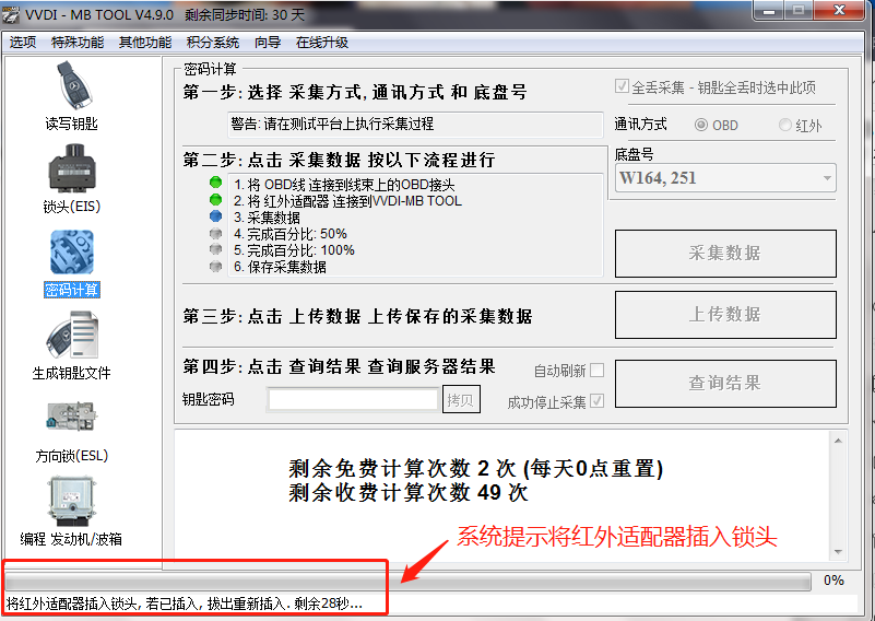 164 251 锁头2009以后 钥匙全丢的连接方式 (线束上不连接电源,免插拔适配器上连接电源) 如果不使用免插拔适配器,整个采集过程需要1.5-2个小时。并且需要人工根据软件提示不停插拔红外适配器。 使用免插拔适配器后,不需要反复插拔只需静置等待即可。