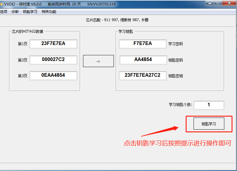 如果是写启动则要保存新生成的文件并且使用编程器反写数据后加密,即可启动车辆。如果是要使用VVDI 学习钥匙,那么生成经销商钥匙后可以不保存新数据,使用VVDI按照下列步骤开始操作。进入钥匙的学习界面 cb29b630c597b3f08178d78b76cb1f3c.png