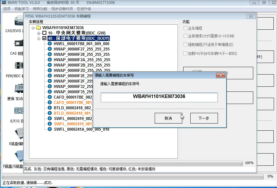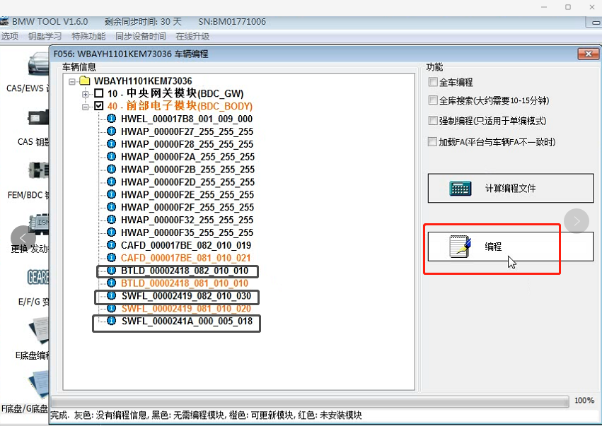 四:勾选前部电子模块(BDC-BODY)--就是要对他进行编程。不需要对10 网关进行编程,所以不用勾选10前面的网关。
