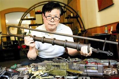 图一 9岁那年,顽皮的周汉春因砸坏家里一把祖传古锁而惹怒父亲遭到一顿 “暴打”。为弥补过失,他发誓定要找回一把同类型的锁……从此,他便与 “锁”结下了不解之缘。如今,他收藏有3000多把从春秋战国到清朝民国的锁具,品种有长命锁、迷宫锁、诗文转轮锁、配饰锁、刑具锁等共1500多种。用材上,有金、银、铁、玉、木、竹不等……这些形态万千,年代不一的中华古锁,将成都周汉春 “锁”了四十多年,成为全国屈指可数的锁具收藏大家。 图二 锁家 寻遍全国古玩店藏3000锁在锁斋 “锁一切能锁之物,锁一切能锁之心。”走进周汉春的家,无论桌椅板凳还是墙上地下,甚至厨房的饭桌也被一把一米长的大锁临时占用(图二)。为了妥善地珍藏他的3000多把古锁,周汉春在自命的“千锁斋”(书房)里用金属材料搭建成一排排货架(图一)。“家里的钱都被他‘锁’光了!”采访中,坐在电视机旁始终一言不发的妻子突然抱怨道。“没关系,只要能够吃得起饭就行了!”周汉春微微一笑地回敬说。 图三 周汉春自豪地说,无论是北京报国寺古玩市场还是丽江古城中的大小古玩商店,甚至新疆、西藏等地的古玩集市他都成了老主顾。他说,以前最大的朋友圈就是收荒行业,无论老小收荒匠几乎都成了他的朋友。甚至周边乡镇的收荒铺只要有锁都会给他留着。在周汉春的眼中,锁的历史就是一部民俗史和科技史。为了收藏这些古锁,他耗费了近40年的时间四处搜寻,几乎花光了家里所有的积蓄(图三)。“中国有着这么悠久的锁文化,但目前正在潜心研究古锁文化的人并不多,直到现在也找不到一本关于中国锁具详细介绍的书籍。所以我希望用自己的力量将中国古锁文化用专著的形式表现出来,书名暂定为《中国锁具与文化》。”周汉春最后强调说。 锁缘 儿时砸坏家传锁40年无意成专家 和锁结缘是9岁那年,周汉春为偷吃柜子里饼干把柜锁砸坏了,被父亲暴打后他才知道那是世上最早的一种诗文转轮中式密码锁,从那一刻起,他立志此生定要找回这种类似的锁。十多年后,在绵阳一个收荒匠的手里他终于如愿以偿地找到了几乎同样的锁。“由此,爱锁、寻锁、探究中华古锁就成了我生活的重要部分!”周汉春说。 图四 2005年7月18日,周汉春得到中央电视台“鉴宝”栏目《鉴宝初选会》的入场券。他抱上从成都带去的一箱子“宝”进去。“什么东西?”“是锁”。专家们和在场的人好像不屑一顾。他从箱子里将“木锁匙”取出,马上就有人说:“不是锁,是木门闩!”他强调:“是锁,肯定是锁,而且是金属锁之前的原始状态的锁!距今已有4000多年的历史了……”经过木器专家仔细辨认并肯定,他又将所带去的战国时代青铜方形镏金锁和唐代银制镏金刻花锁等40把锁一一放在鉴定台上,专家们面对这些琳琅满目的古锁目瞪口呆了。 “原本想利用这次机会把宋代以前的古代锁请真正的专家鉴定一番,谁知……看来当今中国,称得上古代锁具的专家只有我自己了!”周汉春自信地说。 图五 锁史 4000年藏家求爱锁(图六): “每把锁都藏着许多玄机,要了解锁具,不仅要懂得机械,还要懂历史懂文学。”周汉春捧出他收藏的一把最原始的木锁(也叫“求爱锁”)讲道:“这把木锁的结构体现了4000多年前祖先为了安全的需要,从门栓演变成这种木制结构的锁体。这是世界上最古老的锁具。”他详细地介绍这种锁的用途:“这类锁一般存在于藏区,开启完全是凭借经验和技巧。如果有小伙子看上美丽姑娘,他就会用这个木头钥匙去开女孩家的木锁,如果女孩家人喜欢这男孩的话就会偷偷地告诉他开锁的诀窍,这样男孩方可顺利地抱得美人归。”据说,这种锁牢固到如果不知道诀窍却必须开的话,就只能是把房子拆了才行。 诗文转轮密码锁 (图四):只要转动锁上转轮,把转轮上的文字或者记号按一定规律组成一首诗或符号,就能够开锁。无须钥匙,类似现代的保险柜密码。 图六 唐代银制镏金刻花锁 (图五):这是现存非常珍贵的唐代锁具。 最小的锁:“之前,号称世界上最小的锁在英国,只有2.6克。”周汉春用手指尖拈出一把还不及指甲盖大的袖珍锁向我们介绍道,“这是一把清代大户人家用于锁精致鸟笼的白铜锁,只有1.2克。它才真正称得上是世界上最小的锁。” 最大的锁:收藏中最大的一把古锁长一米、重8公斤,据说在古代,这种锁一般用于牢房或粮仓。 |