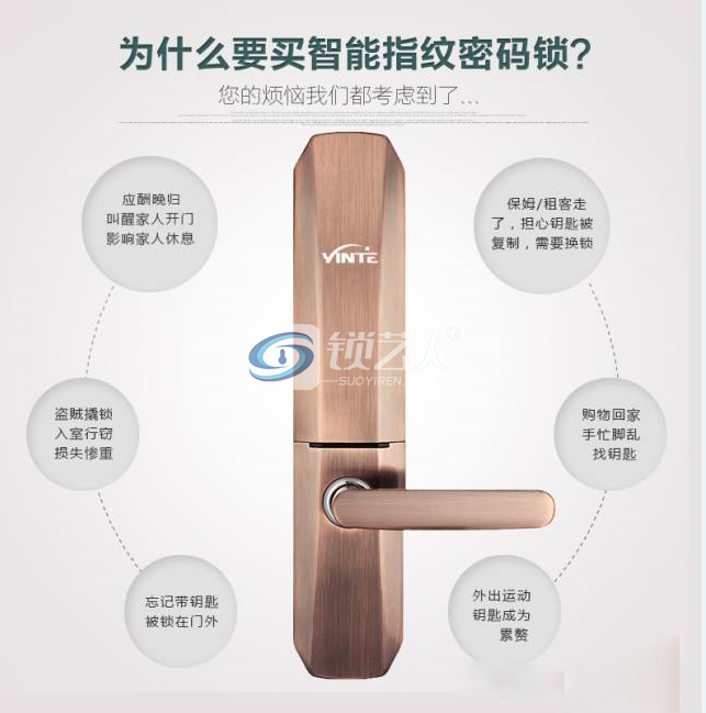 一、再也不会被“忘记带钥匙怎么进门!”的问题烦恼! 二、不必担心“应酬晚归需叫醒家人,影响家人休息” 三、不需要因 “外出倒垃圾,门一不小心锁住,怎么办”的问题恼火 四、不需要为“ 保姆离职后或出租屋换租,担心他们偷配钥匙,需换门锁”的问题而再次破费换锁 五、不必为“客人来了,但不得不放下手中重要的事情去开门”而苦恼 六、普通机械锁钥匙可以复制,指纹具有唯一性,全世界没有两个完全一样的指纹 七、不必随身携带钥匙,一个人的指纹终身不变,一次输入指纹,可以终身使用。而且一个人可以输入不同手指的指纹。触摸即开,反提即锁!! 八、可以容纳多个指纹。既可以登记输入指纹,又可以删除指纹,对指纹的管理非常方便。与普通机械锁相比省去配制钥匙和收回钥匙的烦恼,特别适用于办公用房和出租用房!!! |