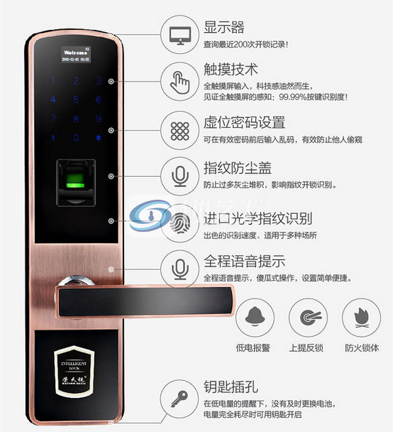 智能锁的功能: 1、 智能锁通过指纹开锁,可以有效解决钥匙丢失、忘记携带、担心他人拷贝等等问题。 2、 全自动上锁: “关门指令”一旦发出,门锁不需要扭把手,会全自动上锁;如果门没有关好,出现门假锁、虚掩的情况,这时智能锁会自动锁上。 3、虚位密码: 4、语音提示 : 6、触摸感应: 屏弃传统机械按键,让您体验如智能手机般灵敏触碰; 7、自动切换左右内外开门: 可以通过智能设置进行左右内外开门切换,不用担心门锁方向问题; 8、钥匙管理功能: 当保姆辞职后,可删除保姆的开门钥匙,保姆的开门钥匙失效,无法再开门,确保家里安全。当遥控钥匙或者开锁的磁卡掉失时,可以进行对所掉失钥匙遥控或者磁卡进行功能清除,安全可靠方便。 |
