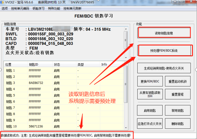 连接好设备读取钥匙信息,系统会提示预处理FEM/BDC,如果提示不用处理则可以直接进入更换匹配选项。