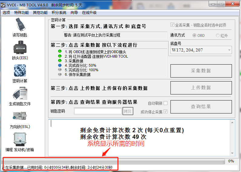 系统会反复提示:红外线适配器拔出,插入的操作。并且显示预计所需要的时间。 按照提示操作大约1-2个小时。如果中途采集失败,断开USB与OBD后重新连接,继续采集。