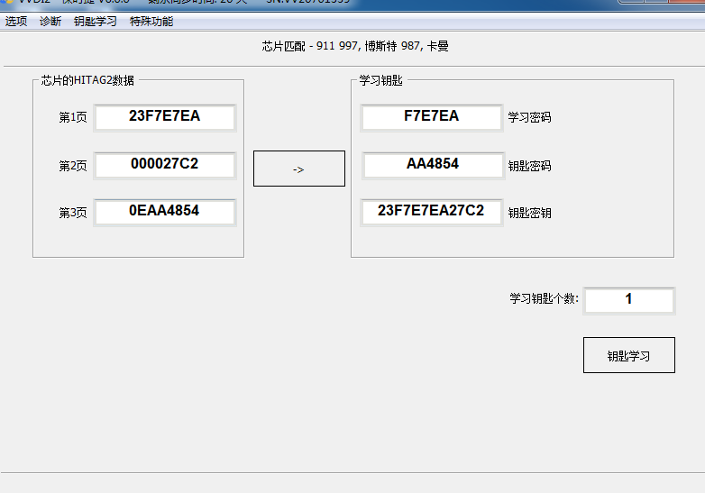 将获取出来的P1 P2 P3 页面数据填写到VVDI2中的保时捷钥匙学习界面中进行密码转换